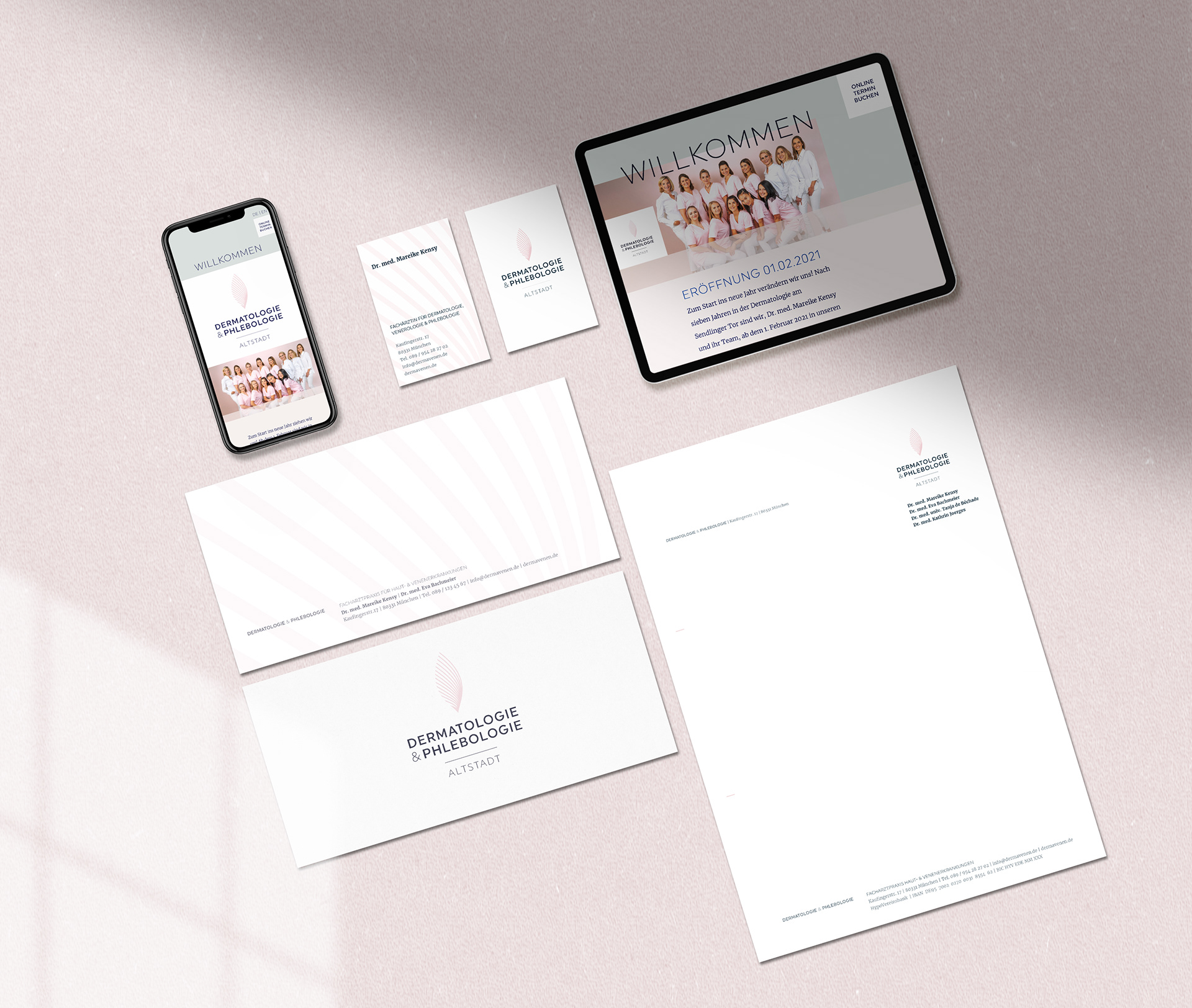 Ausgehend vom Logo entwickelten wir ein komplettes Corporate Design, von der Visitenkarte bis zum Schuhabstreifer, für die neue Praxis in der Münchner Altstadt. Das Farbkonzept zieht sich durch die gesamte Praxis und im Internet.